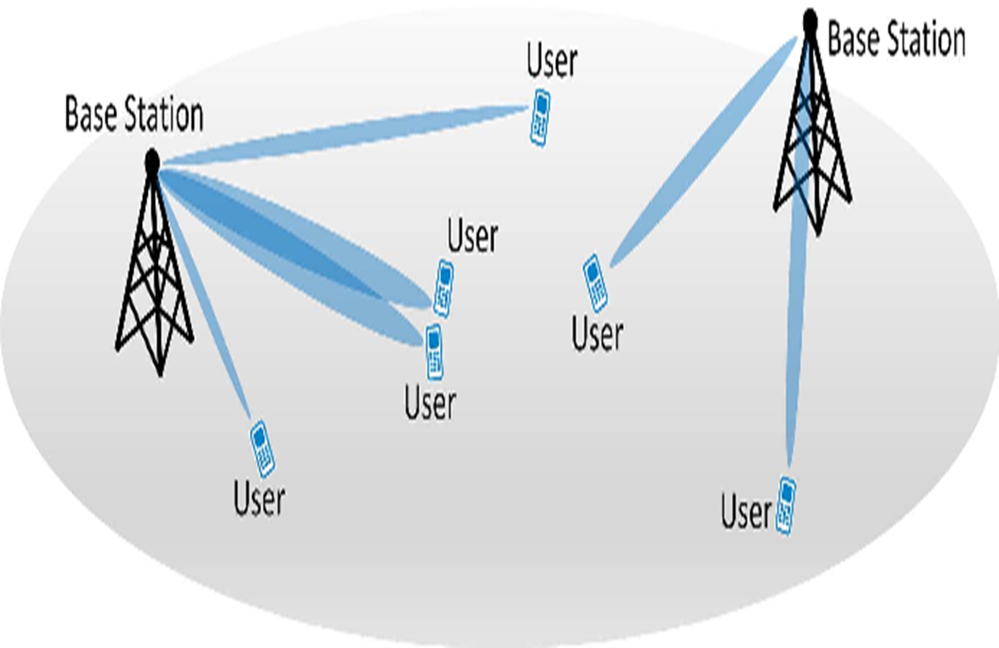 Conceptual scenario of base stations equipped with multibeam antenna system serving multiple mobile device users.